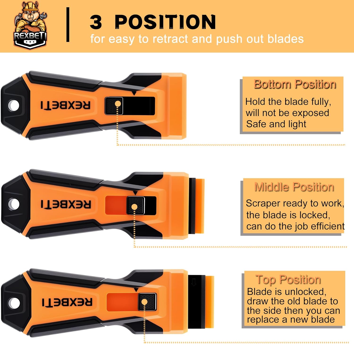 - 3 position for easy to retract and push out blades.Blade replacement is quick and simple, allowing you to maintain the effectiveness of the scrapers