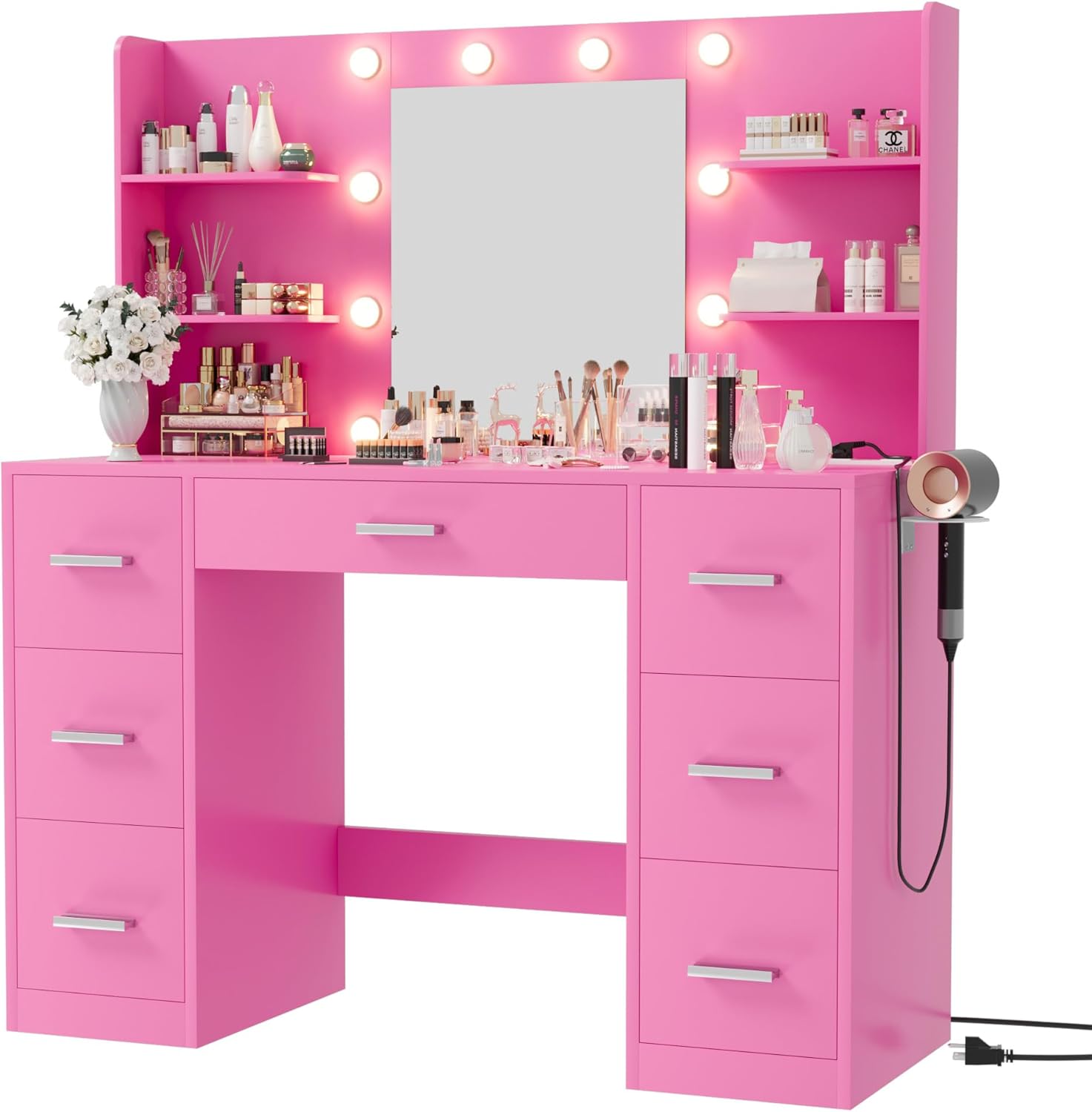 - Powerful Storage Capacity: Large makeup desk with wider desktop, 7 big drawers and 6 open storage shelves helps you categorize better, you can put cosmetics to different areas according to the use of your habit to avoid the desktop messy and can’t find cosmetics.